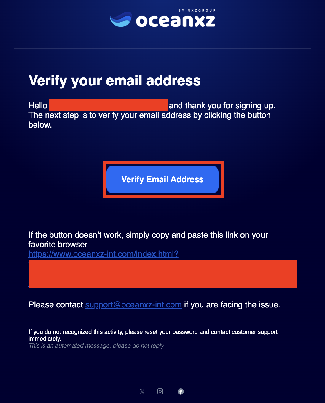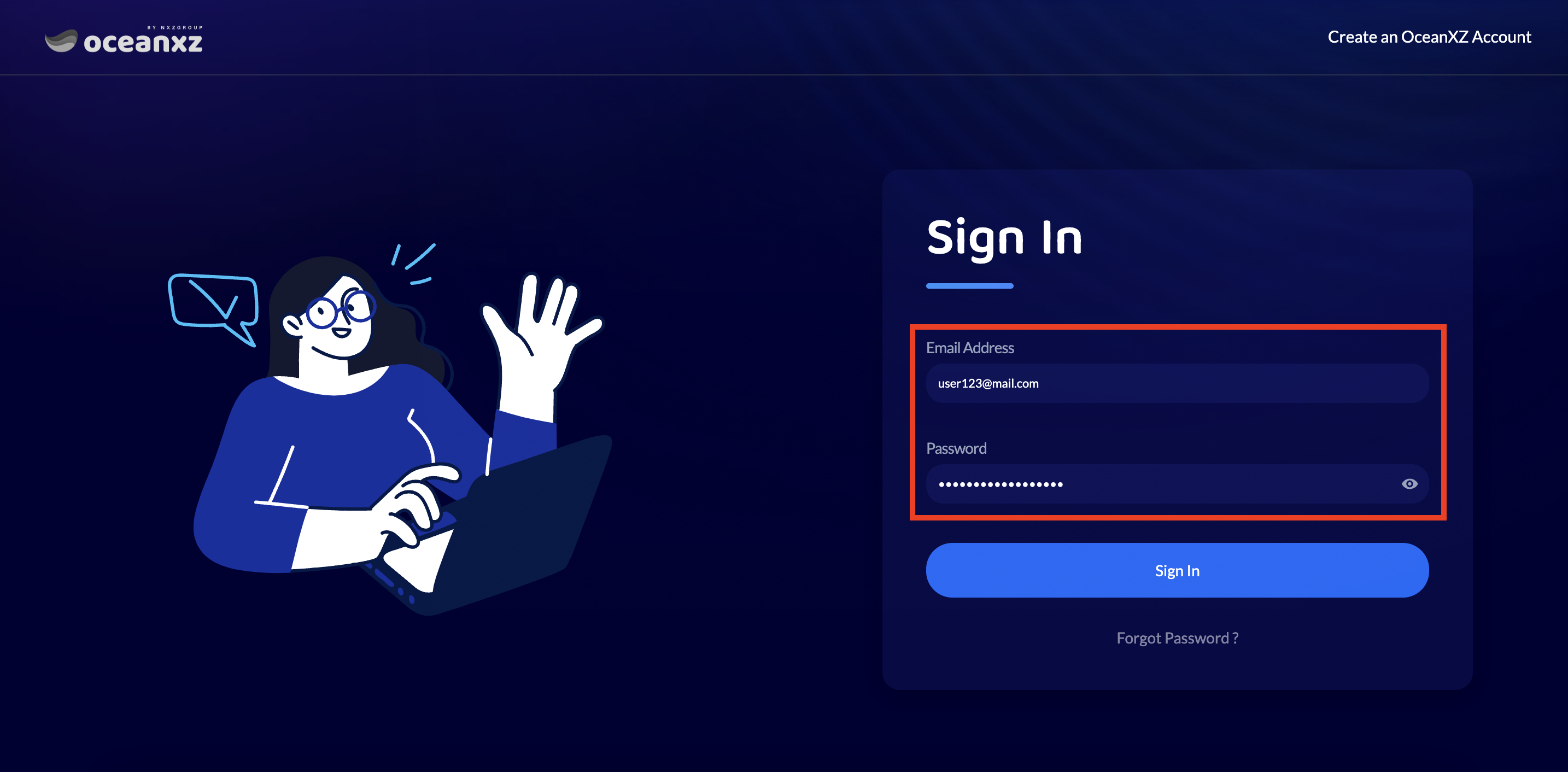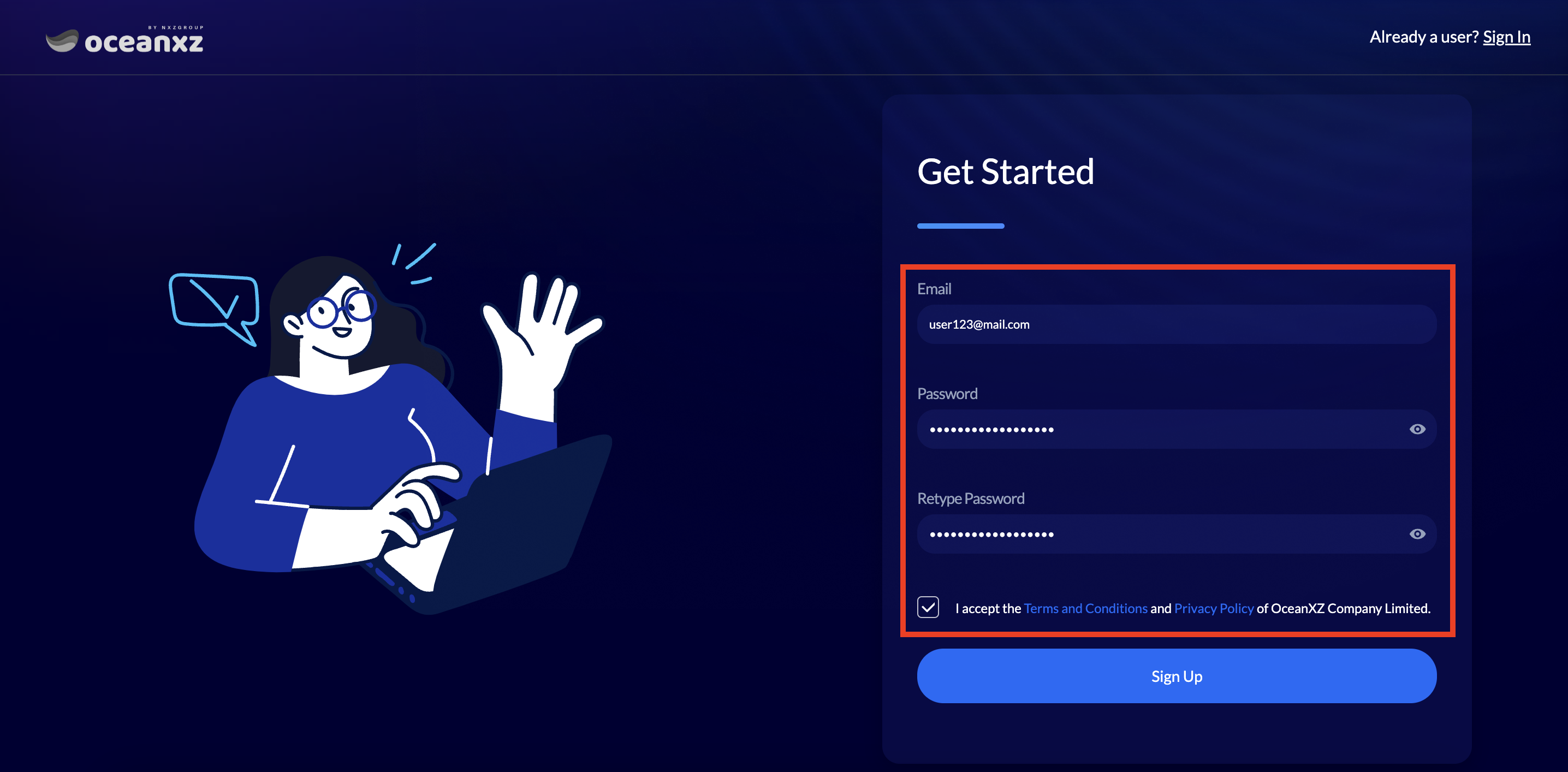 Enter your Email, Password, and Retype Password correctly and completely. Carefully read the Terms and Conditions and Privacy Policy of OceaNXZ Company Limited, then click Accept. After that, click the "Sign Up" button.